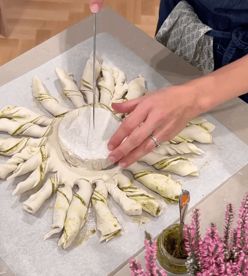 Cut the pastry around the cheese into thin strips and twist them around so that the pesto peeks through. Use the circular cut-out pastry to make a few extra twists and place them on the tray as well. Brush the pastry twists with beaten egg and bake in the oven for 10–15 minutes, or until the puff pastry is golden brown.